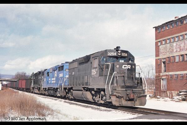 CR 6977 leads a still black GP38-2 and some other power at Summerhill PA, 9/84.