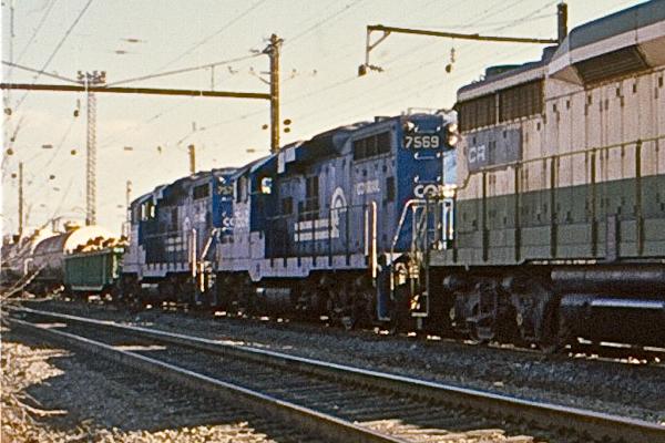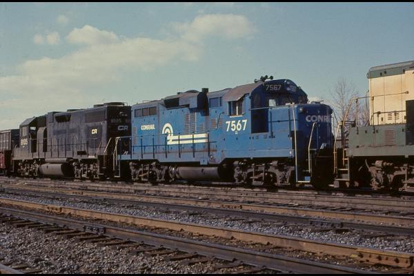 CR 7557 and 7554 move a cut of cars at the west end of Enola Yard in Enola, PA on May 4, 1989.
