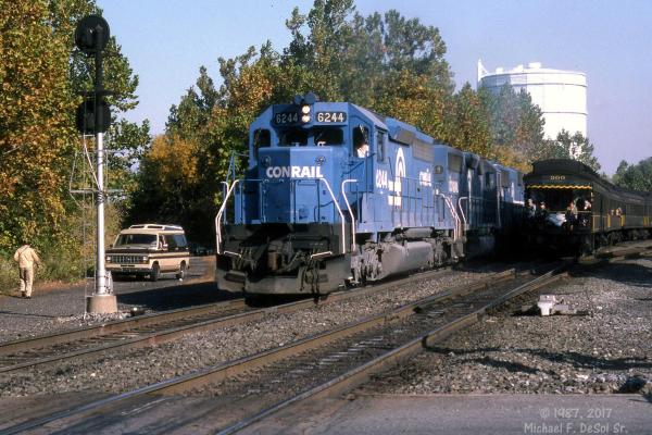 CR 6244 leads a westbound, passing the steam excursion at CP Burn in Allentown, PA. October 1987