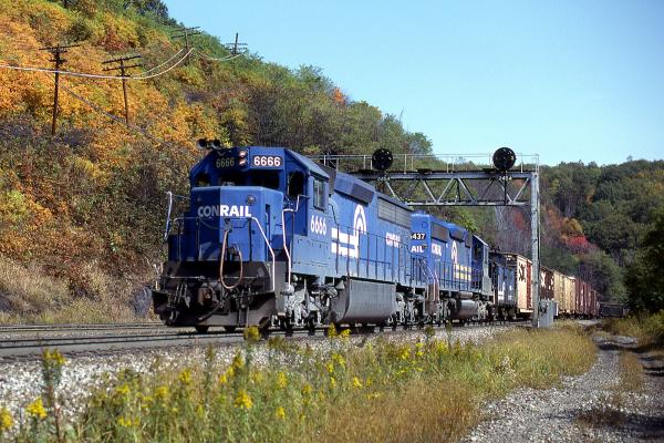 CR 6666 trails the pusher set on the rear of an eastbound Conrail manifest east of Bennington, PA, 10/82