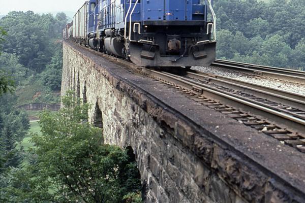 CR 6459 and 6501 lead a westbound Conrail manifest through Warrior Ridge, PA on Oct. 14, 1989