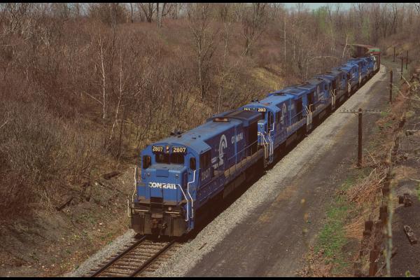 CR 2801 is leading the rail recovery train on the former PRR main in Beavercreek Ohio. 10/88