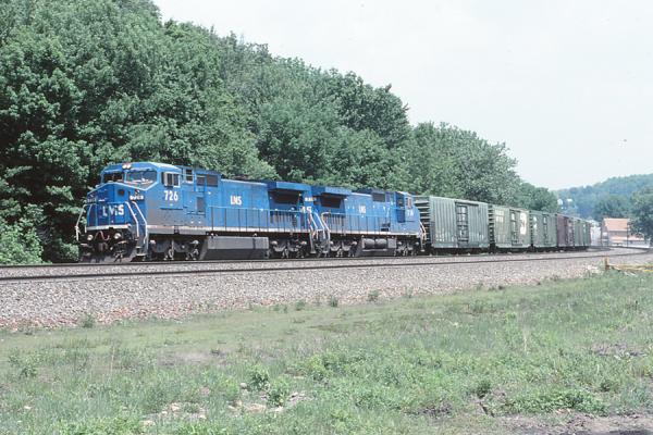 LMS 737 & CR 6485 are crossing Rockville Bridge with UEP-2. 8/16/97