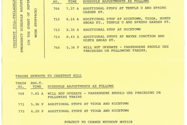 RDG Division Conrail notice for Chestnut Hill to Phila Septa TWU strike adjustments March, 1977