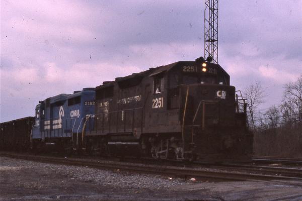 CR 2251 and 2182 with an empty ore train at Abrams Yard, Norristown PA, 12/81
