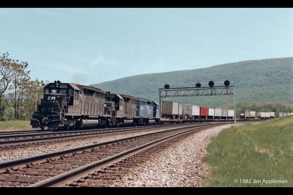 CR 6244 leads a westbound, passing the steam excursion at CP Burn in Allentown, PA. October 1987