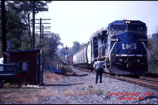 LMS 718 picks up a Form D at the Sheridan Block Station in October of 98