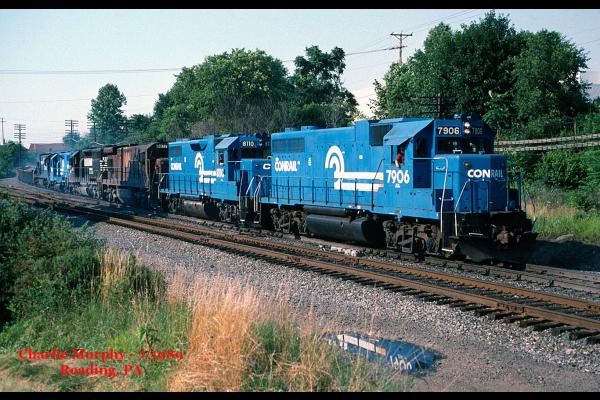 CR 7906, one of the former PRSL GP38s with an extended cab and no dynamic brakes, heads into Reading Yard trailed by an interesting mix of power. 7/89