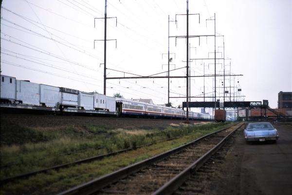 Amtrak 928 GG-1, Eastbound Florida train, Jersey Ave, New Brunswick, NJ. 9/25/78