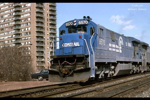 CR 6570 leads a westbound past the "high rise" Newark, NJ 3/10/1985
