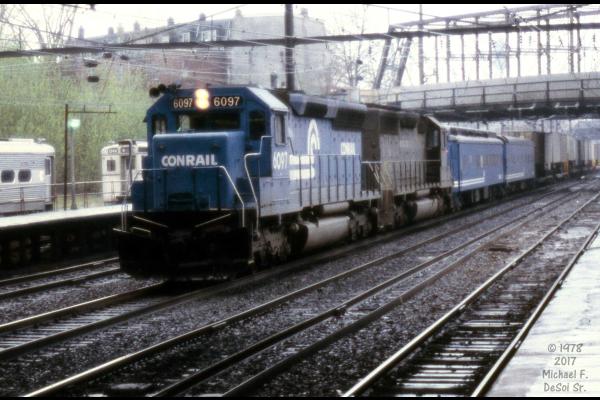 CR 6097 leads an eastbound trailer train (with 2 business cars) through the station in Trenton, N.J. April 1978