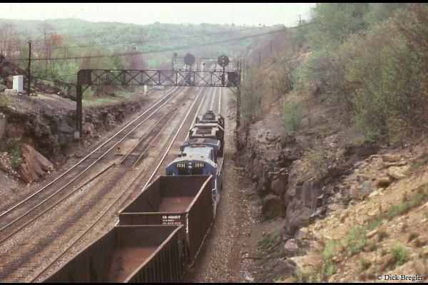 CR 3353 leads a westbound TV train up the mountain at Bennington, 4/80