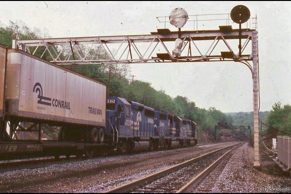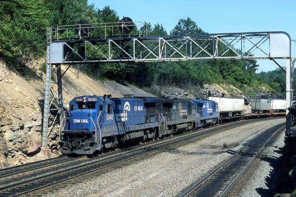 CR 5040 leads a westbound Conrail intermodal train passes under the signal bridge at Bennington, PA on Sept. 8, 1984.
