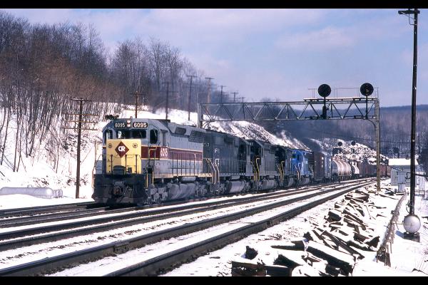 CR 6095 Leads a westbound manifest through Benny, 3/78