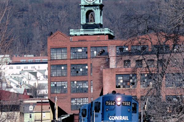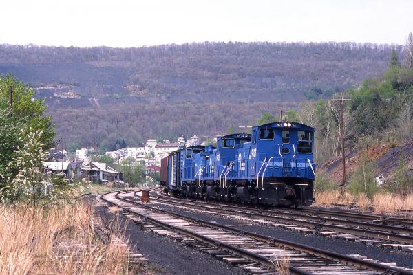 CR 9627 leads WHSN04 past the Glen Burn Colliery in Shamokin on April 29, 1987