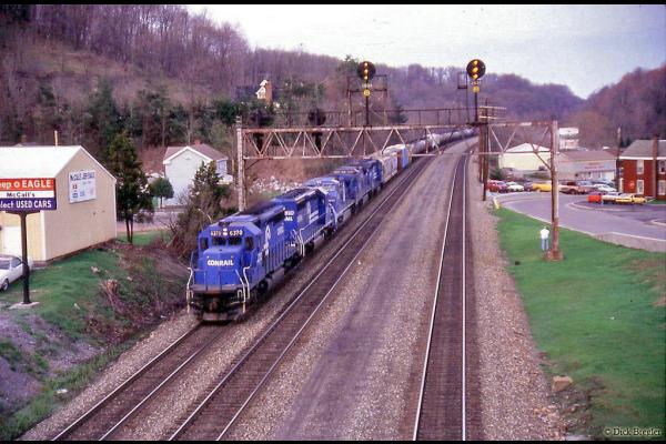 CR 6977 leads a still black GP38-2 and some other power at Summerhill PA, 9/84.