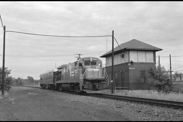 CR 1612 leads a westbound through the station at Frankford Junction, Philadelphia, PA. 4/11/1985