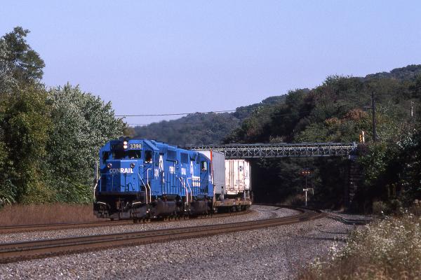 CR 3398 leads a westbound intermodal train around the curve at Thompsontown, PA on Oct. 12, 1989