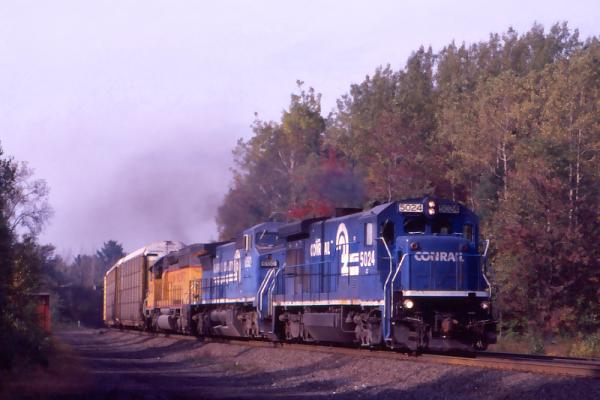 CR 5032 and two more matching B36-7s take an intermodal train west through Newport, PA on April 6, 1991