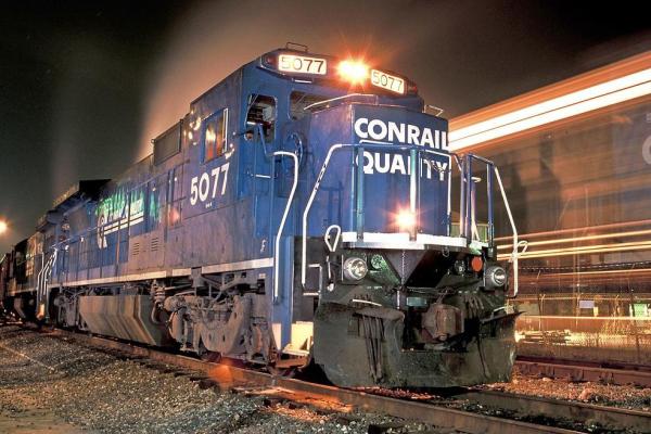 CR 5086 leads Mail 3 passing the classic lattice mast signals on the Reading Belt Line near Cartech in Reading, PA in Fall 1990.