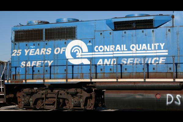 A trio of Conrail autoparts boxcars pass by the CRHS Railthon tent