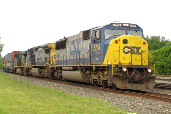 EB CSX multilevel with ex-CR SD60I CSX 8734 on the point