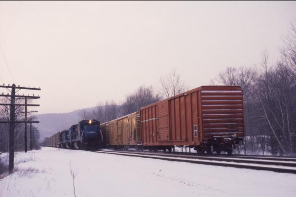 Eastbound SEFR rounds the curve coming up on CP 123 in Chester, MA. at 08:51 on May 12, 1988. The sun has gotten high enough by this time to spread it's light into the scene.