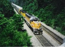 UP 3439 and CNW 6881 leads train PREL -5 near Otis, IN on June 15, 1996. This train stalled out on the grade on the hill at Otis and needed a push to get going again. As you'll see in another shot, they took the two units off the following UDM coal train(ironically also UP powered) and had them couple up and push the PREL over the hill all the way to CP 463 in LaPorte.
