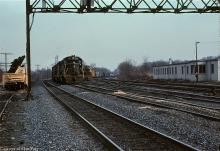 PRSL GP38 2001 (CR 7661) pauses with sister-unit 2007 (CR 7668), GP9 7157 and C425 2423 at the Abrams yard office in February, 1977.