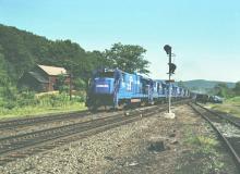 It's 14:50 at the New York/Mass State line as the first of 5 trains and a light engine move to come over the next 3 1/2 hours arrives in the form of westbound ballast train BOR723. To add interest, these moves will have a SPENO ballast Cleaner working in the area with which to contend. A CR track crew is making some weld repairs to one of the switches near the CR truck along the track. As a side note, the barn at left has recently been razed, as the satellite view shows an empty lot strewn with piles of rubble. Another "photo prop" bites the dust!