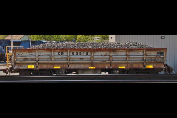 Air dump car 53315 and 3 camp cars headed west in FRSE on the Hinsdale flats, Oct. 4, 1997.
