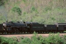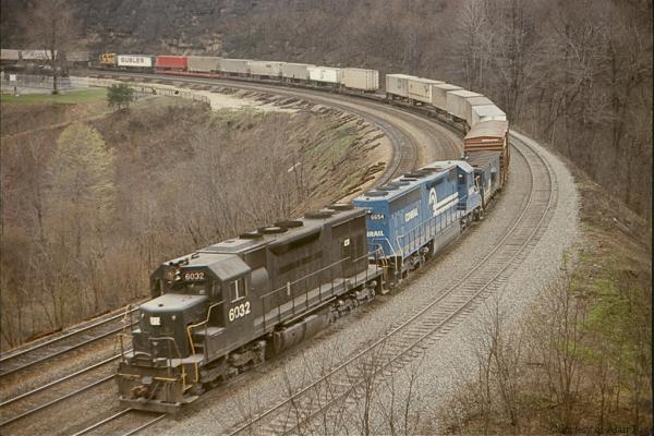 While a Conrail freight pounds up Horseshoe Curve in the afternoon of May 22, 1977, former Reading T-1 4-8-4 #2102 and GTW 2-8-2 #4070 arrived, backing a line of passenger cars down the Curve.