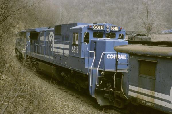 On the afternoon of May 22, 1977, former Reading T-1 4-8-4 #2102 and GTW 2-8-2 #4070 begin to make their climb up Horseshoe Curve on their way back to Pittsburgh. All manner of steam railfans were gathered around the massive Curve to capture a glimpse of the powerful 4-8-4 and neither steamer disappointed. For the second week in a row, Steam Tours, Inc. ran a Pittsburgh to Altoona excursion led by the famed Reading Company T-1 #2102. The Northern was lettered "Allegheny" following her 1974 purchase from Steam Tours by the Allegheny RR Tour Group of Ohio. The former Grand Trunk Western Mikago was lettered "Cuyahoga Valley Line." Built October, 1945 at the Reading, PA shops using components from class I-10sa Consolidation #2044, T-1 #2102 was used for fast freight service until stored in the mid-1950's. As part of the Reading Company's successful Iron Horse Ramble excursions run from 1959-64, #2102 was used extensively. After the Rambles ended, the T-1 was sold to Steam Tours in 1966, then to Allegheny RR Tour Group in 1974, and in 1977 sold to Rail Diversified of Ohio. In 1985, RCT&HS-sponsored tours to bring the Northern home to Reading, PA. Finally, #2102 was sold to Andrew Muller who operated tours into the 1990's on the Blue Mtn & Rdg tourist line and Reading & Northern. The steamer is stored in Port Clinton, PA on the R&N awaiting repairs. (Historic info provided by the Reading Company Technical & Historical Society)