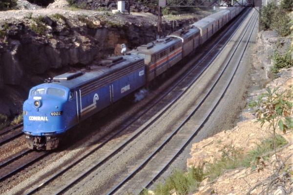 A MARC train was used for Altoona Railfest '98 excursions around Horseshoe Curve and up the mountain to the loop track at Gallitzin and return to Altoona. MARC 51 and 65 GP40WH-2s was the motive power used in pull-pull configuration eliminating the need to run around the train for each trip out of Altoona. Seen here with MARC 65 leading, the train heading back to Altoona has just come off the loop at AR tower.