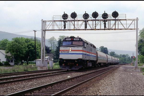 Amtrak's eastbound Broadway Limited with F40PH 300 & 263 leading, running on Track 2 as Track 1 is out of service for rail replacement, rolls through the valley of the Little Juniata River in autumn's splendor.