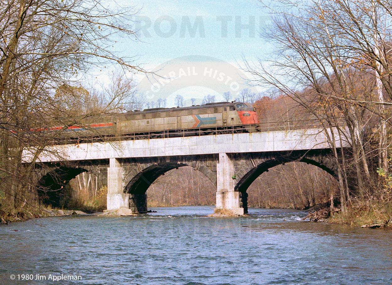Eastbound Amtrak #40, the "Broadway Limited", led by AMT 448 E8A crosses the Little Juniata River.