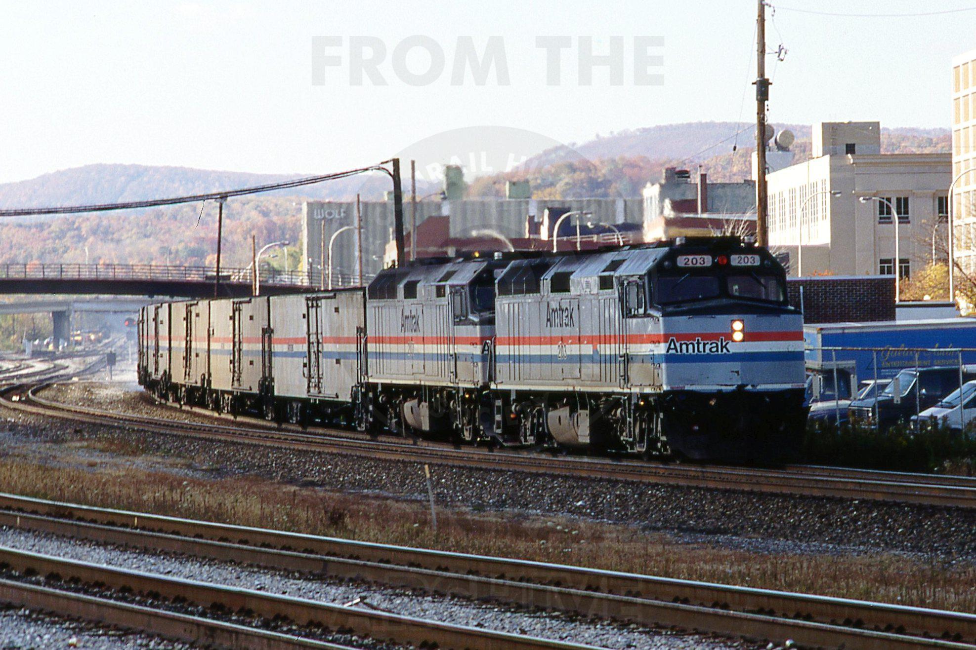 Previous Next Photo By Rich Bowes AMTK 203 EMD F40PH Pittsburgh Line Altoona PA with AMTK train #40 Year 1993 Original Date 10/1/93 Location Altoona PA Subject(s) Amtrak on Conrail Collection CRHS Conrail Photo Archive Contributions
