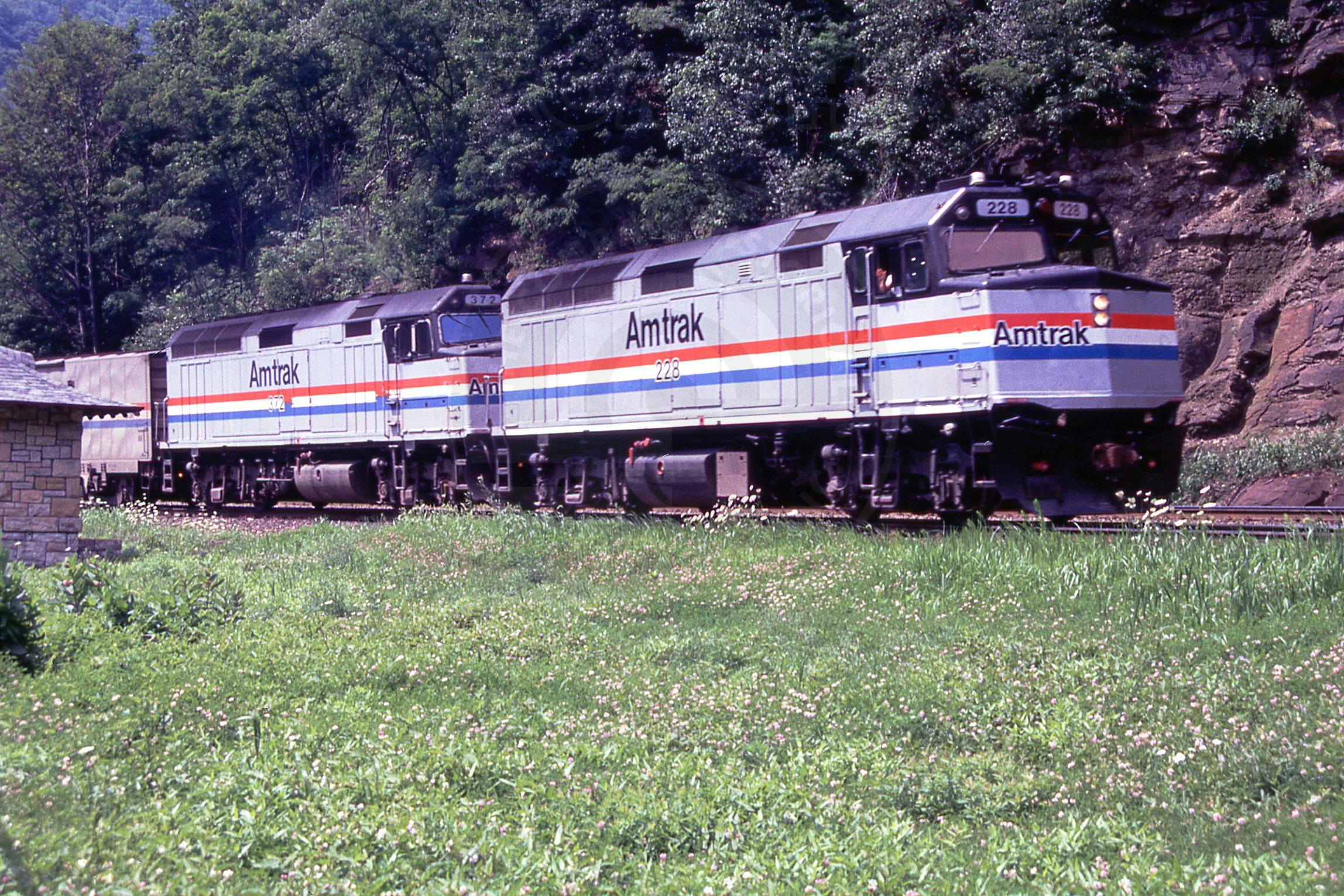 Previous Next Photo By Rich Bowes AMTK 228 EMD F40PH Pittsburgh Line Logan Twp PA Horseshoe Curve with train #40 Year 1992 Original Date 8/1/92 Location Logan Twp PA Subject(s) Amtrak on Conrail Collection CRHS Conrail Photo Archive Contributions