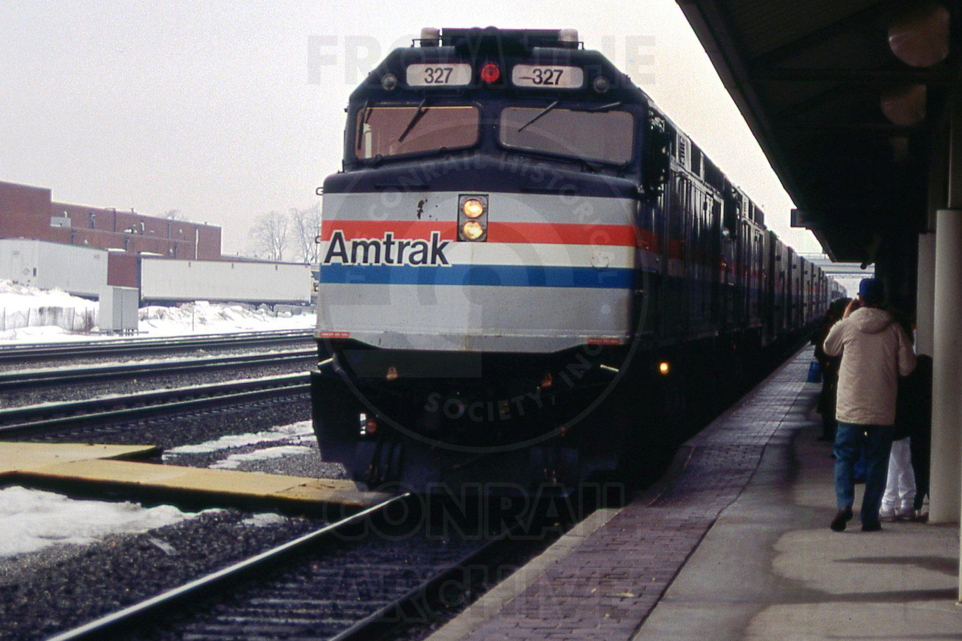Previous Next Photo By Rich Bowes AMTK 327 EMD F40PH Pittsburgh Line Altoona PA with train AMTK #42 Year 1994 Original Date 3/1/94 Location Altoona PA Subject(s) Amtrak on Conrail Collection CRHS Conrail Photo Archive Contributions