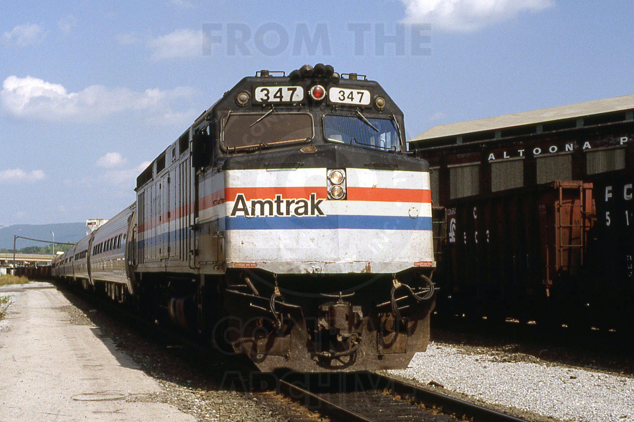 Previous Next Photo By Rich Bowes AMTK 347 EMD F40PH Pittsburgh Line Altoona PA with AMTK train #43 Year 1991 Original Date 8/1/91 Location Altoona PA Subject(s) Amtrak on Conrail Collection CRHS Conrail Photo Archive Contributions