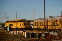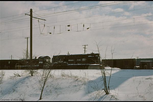 Former PRR MP-54 Combine 495209 rests beside Amtrak MOW 15152 at Morrisville in March, 1977.