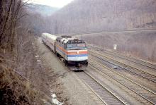 Previous Next Photo By Alan Page Amtrak F40PH 277 blasts up the curve in March, 1981. Year 1981 Original Date 3/13/81 Location Horseshoe Curve PA Location Details Horseshoe Curve Additional Galleries Alan Page's CR: 5-1980 to 4-1981 Subject(s) Foreign Power on Conrail Collection CRHS Conrail Photo Archive Contributions