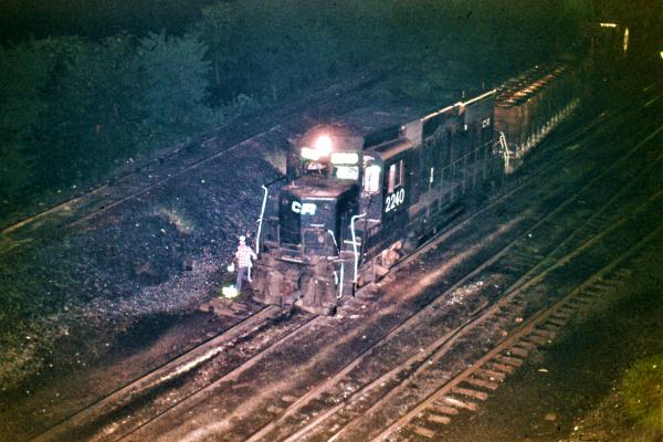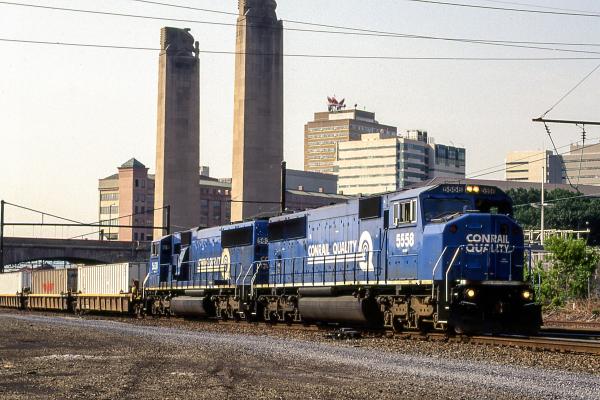With a CR TV train rolling by the Harrisburg engine terminal, Amtrak GG-1 4935 rests a month after restoration to her original PRR livery.