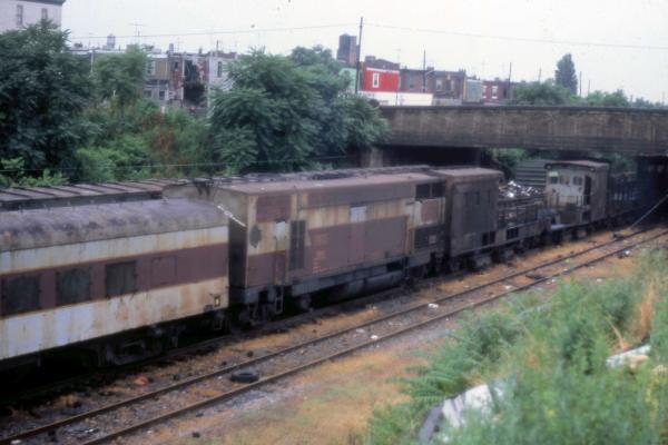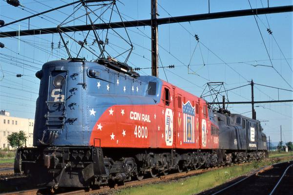 Former PC 9140 baggage car rested on the tracks behind Amtrak GG-1 4939 (ex-PC 4939, nee-PRR 4927).