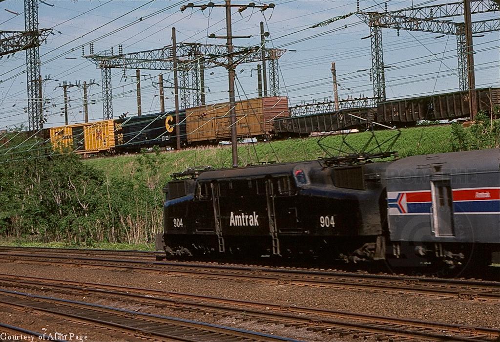 While a pair of ex-PC E-44's(4442 and 4404) lead a mixed freight on the high line, Amtrak GG-1 904 roars past Arsenal tower on May 15, 1977. All attention this day, however, was focused on the next Amtrak train to come through: The maiden run of refurbished former PRR GG-1 4935 sponsored by the "Friends of the GG-1."