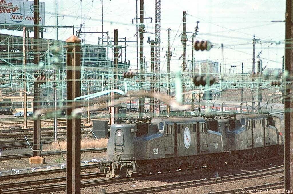 With a mixed freight pulled by boxcab electrics on the highline, a pair of Amtrak GG-1's led by the Savings Bond 921 pull commuters into Philadelphia's 30th Streeet Station.