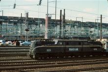 With a CR mixed freight on the highline, Amtrak GG-1 929 pulls commuters into Philadelphia's 30th Streeet Station in April, 1977. Though unpleasant for commuters, the 44-day Septa TWU strike from March 25 to May 8, 1977 brought an interesting mix of CR and Amtrak power to the 30th Street engine terminal.