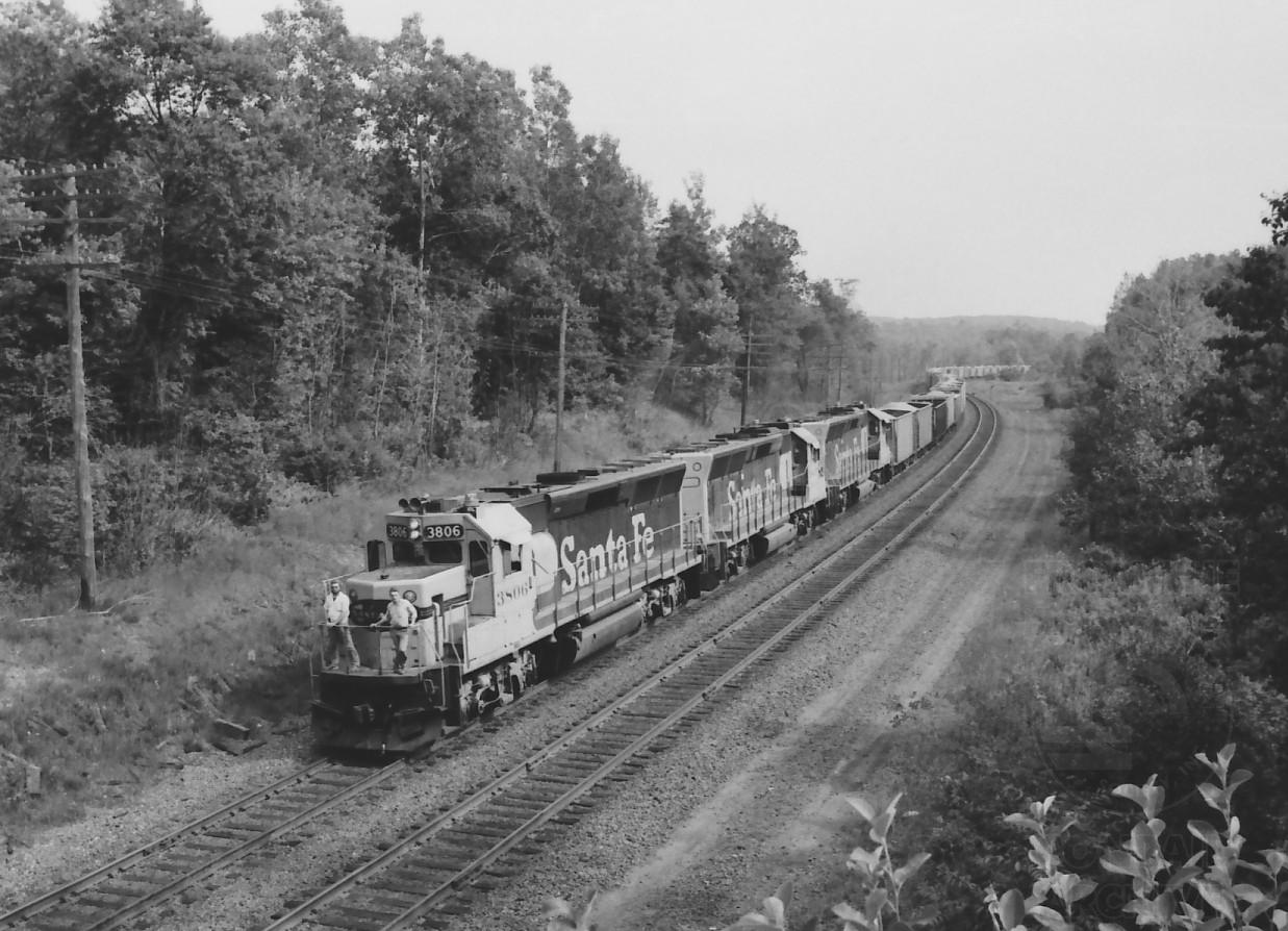 The three Santa Fe GP40-X's with a westbound ballast train at the summit in Hinsdale, MA. on July 20, 1979.