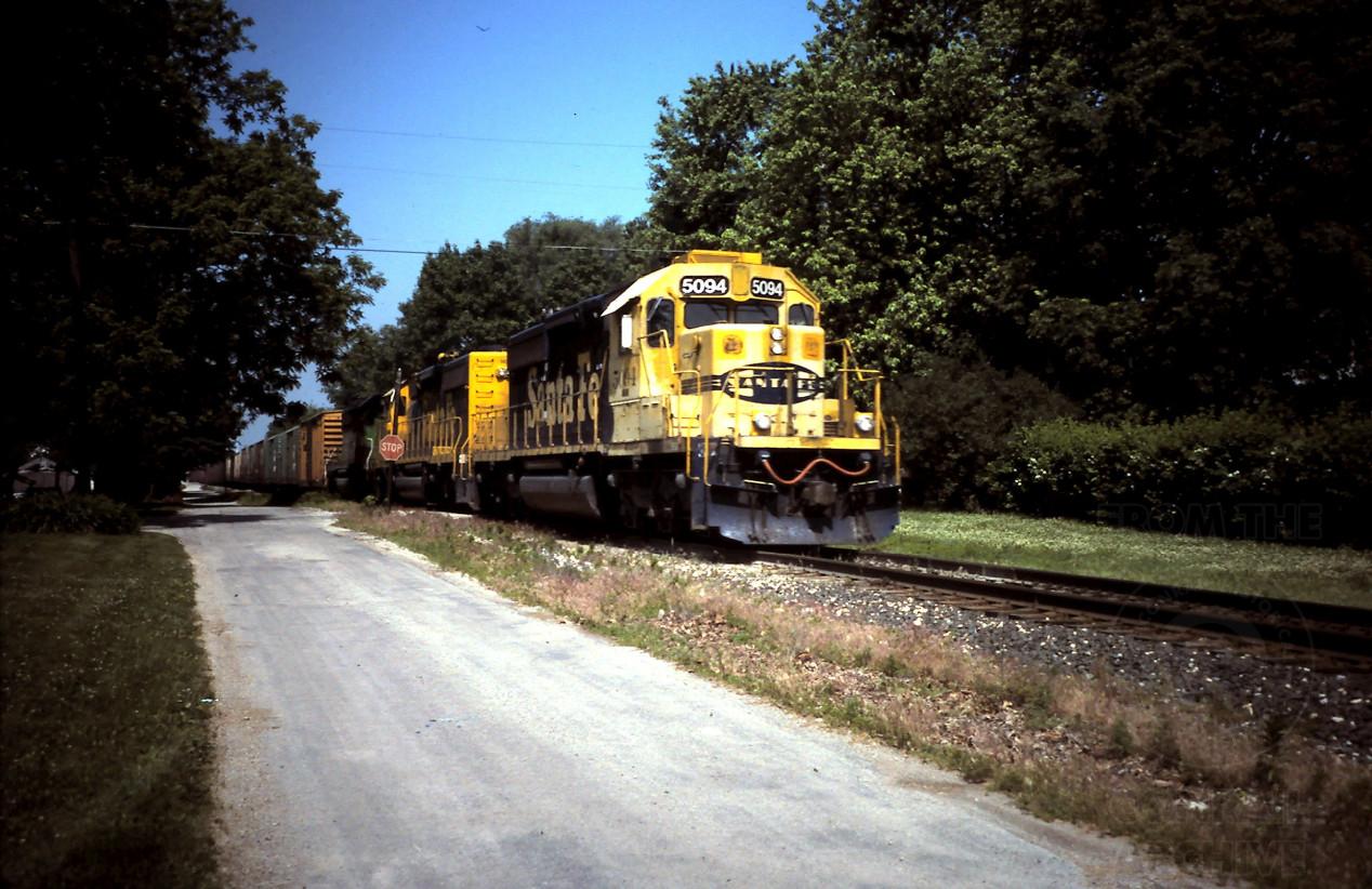 Previous Next ATSF 5094 and fellow SD40-2's powers SFEL-8 thru Momence, IL on the Kankakee Secondary June 18, 1997. Photo By Chris Howe Year 1997 Original Date 6/18/97 Location City Momence IL Additional Galleries Chris Howe's Conrail action 1997 Collection CRHS Conrail Photo Archive Contributions