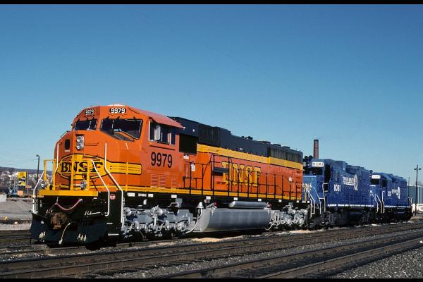 Santa Fe 5816 and 5072 leads this westbound freight(most likely ELSF) on Conrail's Chicago Line under the IHB's Burns Harbor Branch on the east side of Gary, IN, in January 1993. Doug Davidson photo with permission